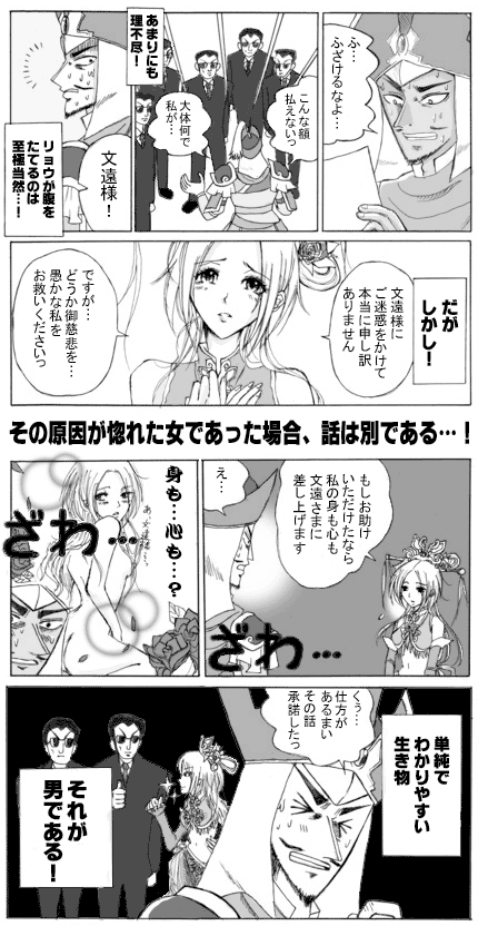 下の日記の妄想をマンガにしてしまいました 貂蝉のおしゃれ資金に利用されていた張遼は、 膨大な借金をつきつけられ、どうするのか!? ※カイジパロです。 カイジのイメージを崩したくない方は見ないほうがいいかもしれません。 あと、張遼の性格もかなり崩壊してます。 貂蝉は無双5仕様(練習中)、張遼は無双4仕様です。 それなりの覚悟がある方のみ、画像をみるようにしてくださいませ 久々に描いた漫画がこれかい!! というかねぇ~私もこんな性格の張遼はいや・・・(笑) まぁ、遊びたかっただけなので、これは軽いネタということで でも描いててすごく楽しかったよカイジパロ! このあと、張遼は希望の船エスポワールに乗って、限定じゃんけんしに行けばいいよ。 そうそう、三国志大戦3で、ついに蒼天航路のLEカードが出ました。 LE張遼かっこいいです!正直、新SR張遼は微妙なので、使うなら絶対LEです。 騎馬単なんてそもそも使える自信ないけど~~(笑) 今日の頂上対決で、LE曹操が! やべぇ、かっこいい! あのソソ様が!戦場を駆け抜けている! いやあああああ! そして、復活時の台詞 「ならばよし!」 わああああああああ!この台詞を使うとは!!やってくれる! どうしよう!興奮がおさまらねえ!
